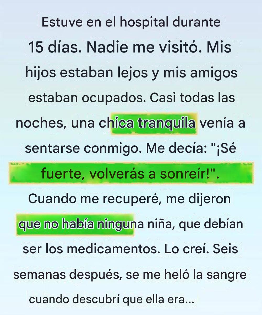 Nunca se presentó ni explicó por qué había venido. Simplemente acercó una silla a mi cama y se sentó con las manos cruzadas, como si perteneciera a ese lugar. No podía hablar ni preguntar nada, pero de alguna manera me entendió.